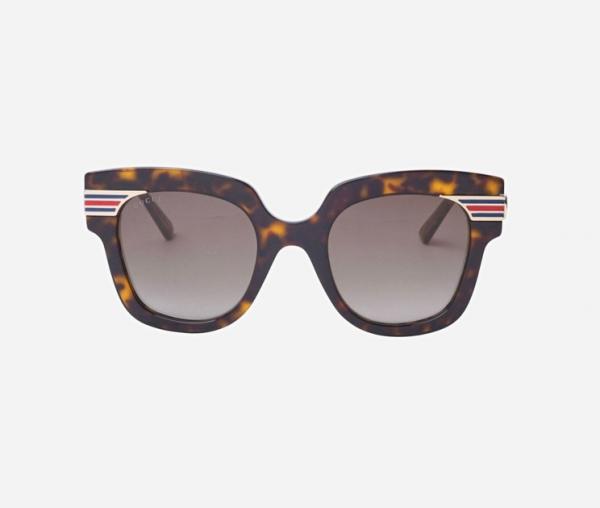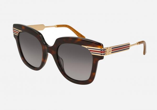 Occhiali da sole dalla forma cat-eye sono realizzati in metallo color oro e con acetato avana, ornati con l'iconico logo ad incastro GG di Gucci sulle aste a striscie viola e rosse leggermente affusolate.Terminali in acetato color miele con effetto glitterato.