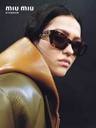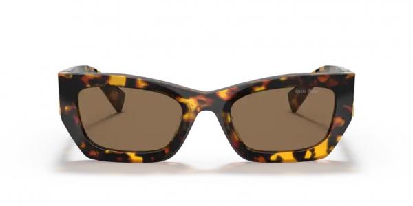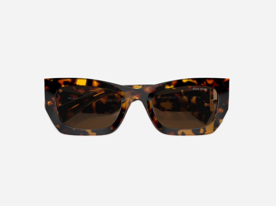 La montatura risulta a punta ai lati con aste possenti arricchite dal logo Miu Miu in metallo brillante.